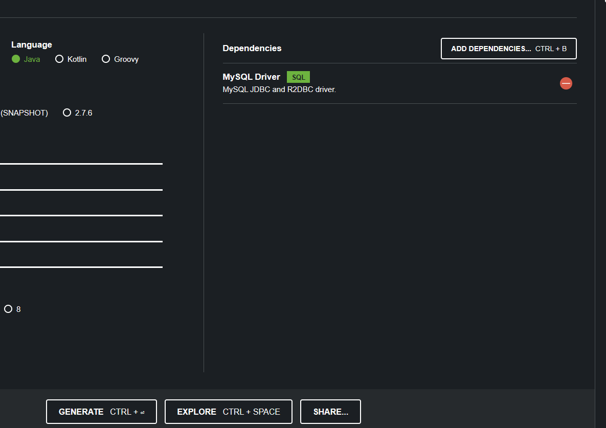 해당 dependencies의 부분을 살펴보자. 우리가 기존에 프로젝트에서 mysql을 사용했던 코드는 아래와 같다.