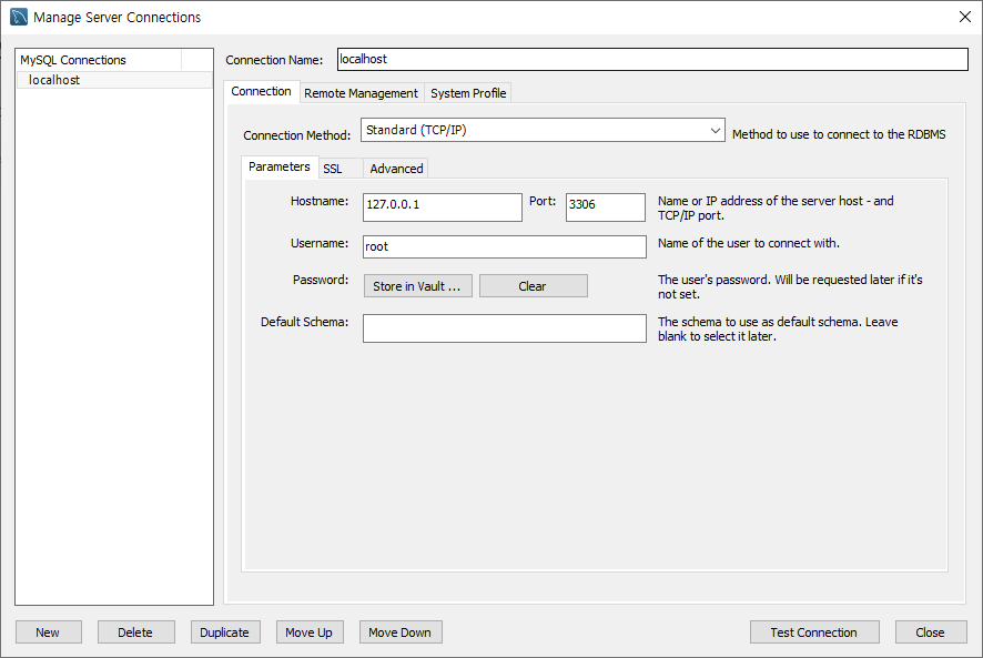 위의 사진을 보면 나의 경우 서버가 학습과정이어서 localhost였으며, 포트번호는 기존에 3306으로 지정을 한 상태였다. 또한 DB명인 schema의 경우 JPA를 학습하면서 jpa로 생성을 하였기에 DB명은 jpa로 지정 후에 각 데이터베이스 및 테이블에서 지정되어야 할 속성을 정리하였다.