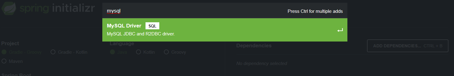 해당 항목의 dependency 항목을 누르게 되면 본인이 원하는 항목을 가져오려면 build.gradle항목에 무엇을 넣어야 하는지 알 수 있다. mysql의 연동을 위해 해당 키워드를 입력하면 아래의 창이 뜨면서 dependency항목에 추가가 된다.