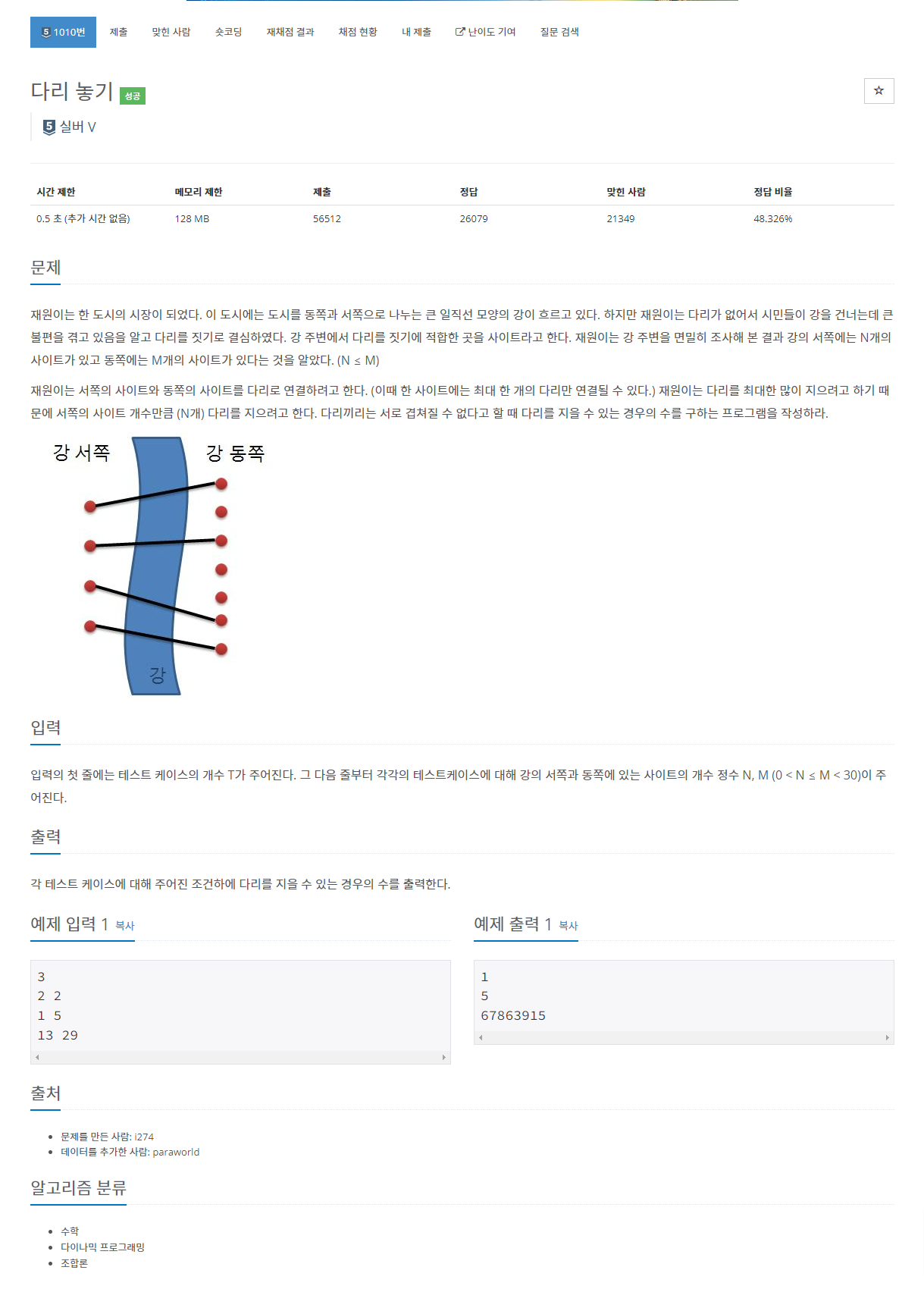 문제 출처: 1010번: 다리 놓기 (acmicpc.net)